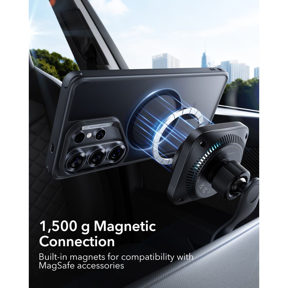 HaloLock est le système magnétique développé par ESR, certifié compatible MagSafe, qui garantit un alignement précis et un maintien solide pour tous les accessoires MagSafe : chargeurs, supports et portefeuilles magnétiques.