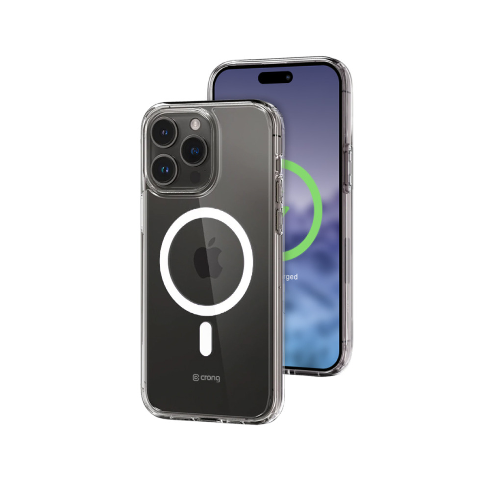 Coque Crong transparente et MagSafe pour iPhone 15 Pro avec 39 aimants intégrés, protection hybride, maintien magnétique fort et design ultra-clair.