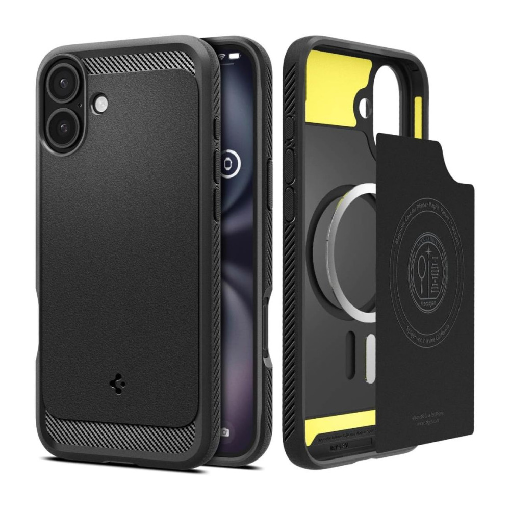Coque iPhone 16 Rugged Armor Spigen noir mat : compatibilité MagSafe