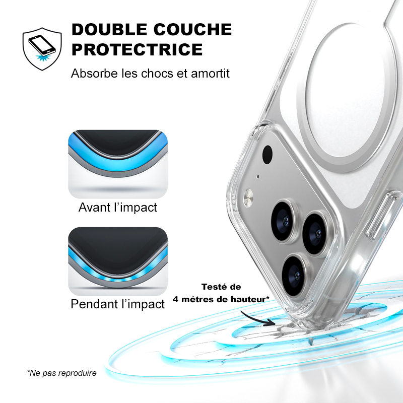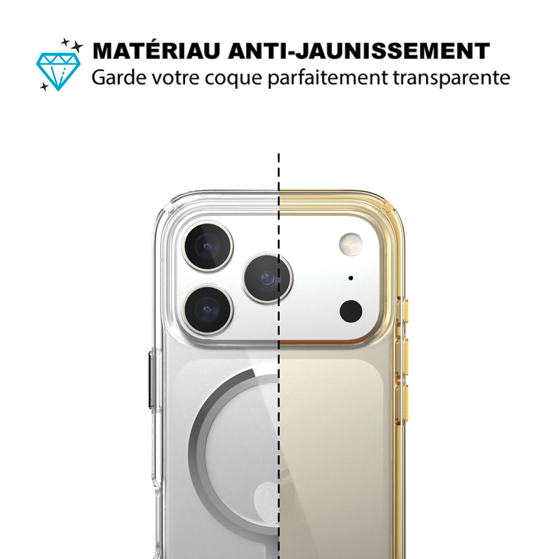 La coque est fabriquée en TPU haute qualité avec un traitement anti-jaunissement qui ralentit considérablement la décoloration. Elle conserve sa transparence bien plus longtemps qu’une coque classique.