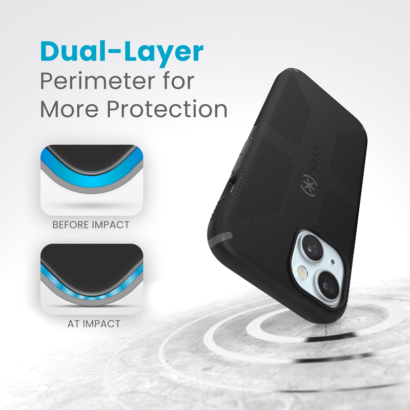 Fabriquée avec des matériaux soigneusement sélectionnés par Speck, cette coque absorbe les chocs du quotidien grâce à un cadre renforcé et un dos résistant aux rayures. Les bords surélevés protègent l’écran et les objectifs photo lorsque le téléphone est posé à plat. Consultez nos guides TPU et polycarbonate pour tout savoir sur ces matériaux.
