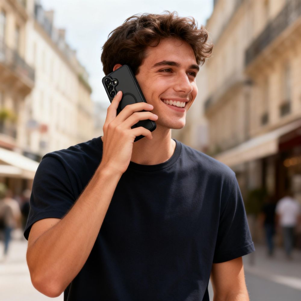 La Coque Samsung Galaxy S26 Plus Tech-Protect MagCam MagSafe Noir Mat allie un dos en polycarbonate dépoli fumé noir et un contour TPU noir mat à un anneau magnétique MagSafe intégré. Un look entièrement noir sobre et élégant pour une protection quotidienne efficace.