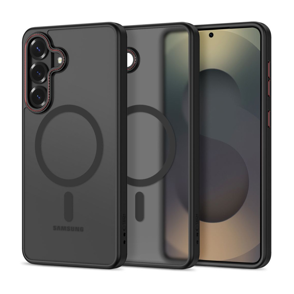 La Coque Samsung Galaxy S26 Plus Tech-Protect MagCam MagSafe Noir Rouge se distingue par son dos en polycarbonate dépoli fumé noir agrémenté d’un liseré rouge autour des boutons et du module caméra. Son anneau magnétique MagSafe noir intégré assure une compatibilité totale avec les accessoires MagSafe.