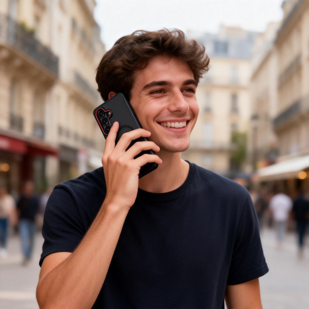 La structure hybride associe un polycarbonate rigide dépoli à un cadre TPU souple absorbant les chocs. Les accents rouges sur les boutons et le contour caméra apportent une touche sportive distinctive. Les bords surélevés protègent l’écran et l’objectif caméra. En savoir plus dans notre guide bien choisir sa coque.
