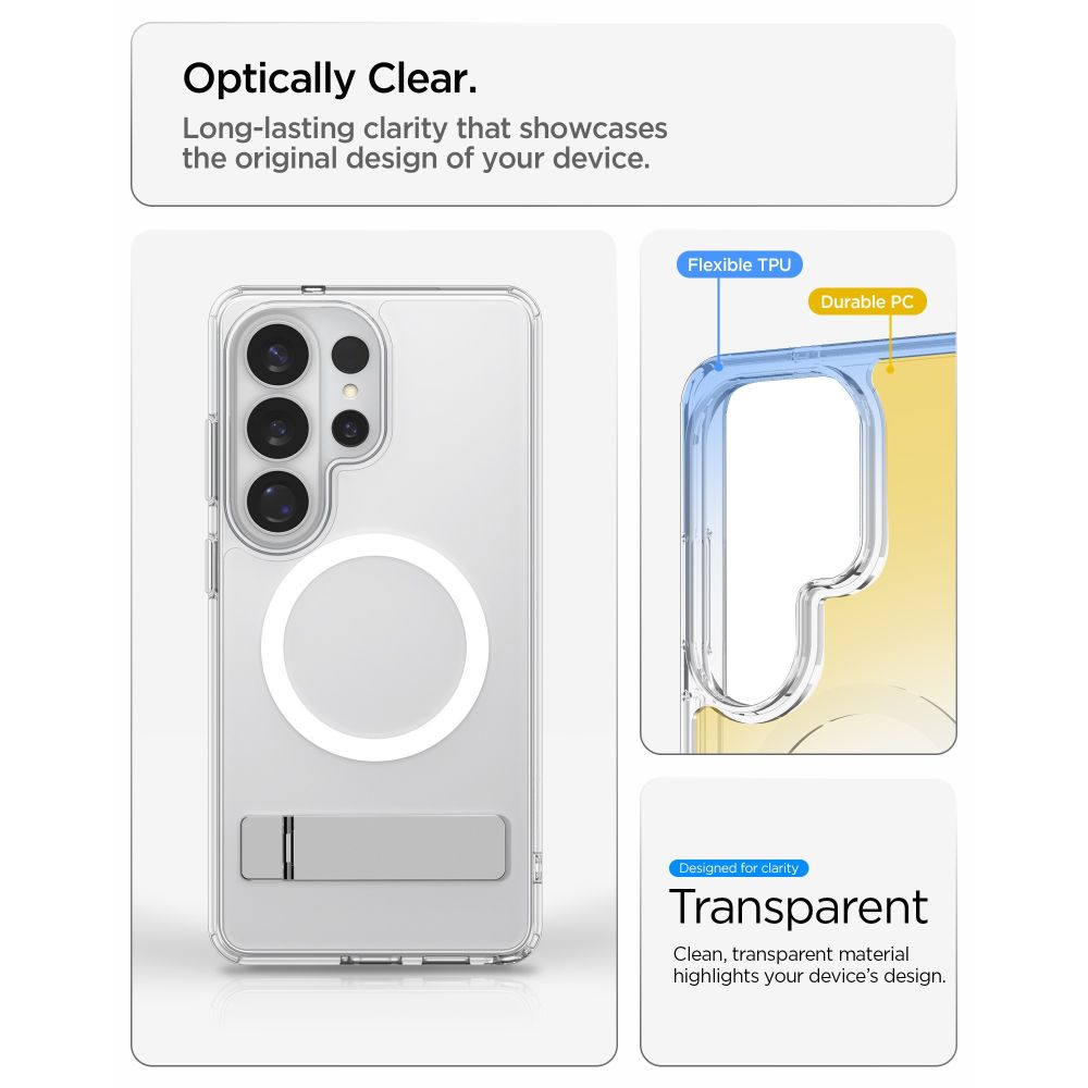 La Coque Ultra Hybrid « S » MagSafe pour Samsung Galaxy S26 Ultra Spigen transparent/blanc associe un design soigné à une protection solide pour votre smartphone haut de gamme et son grand écran Dynamic AMOLED 6,9 pouces. Conçue en TPU (polyuréthane thermoplastique) souple et résistant, cette coque allie souplesse et robustesse pour encaisser les chocs du quotidien sans alourdir votre Galaxy S26 Ultra. L’anneau magnétique intégré assure une compatibilité totale avec l’écosystème MagSafe : supports, portefeuilles magnétiques et chargeurs se fixent avec précision.